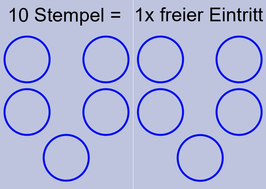 Diese ist vom Prinzip her eine Art Stempelkarte, wie Sie sie vom Friseur oder dem Café nebenan kennen: Wer 10 Stempel gesammelt hat, bekommt 1 Eintritt kostenlos dazu.